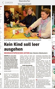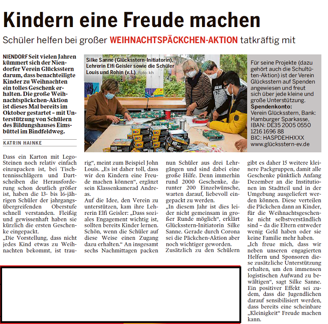 - Im Jahre 2012 konnten wir ca. 500 Kindern aus sozialschwachen Familien im Großraum Hamburg durch unsere Weihnachtspackaktion mit einem kleinen Geschenk unter dem Weihnachtsbaum ein wenig Freude bereiten.