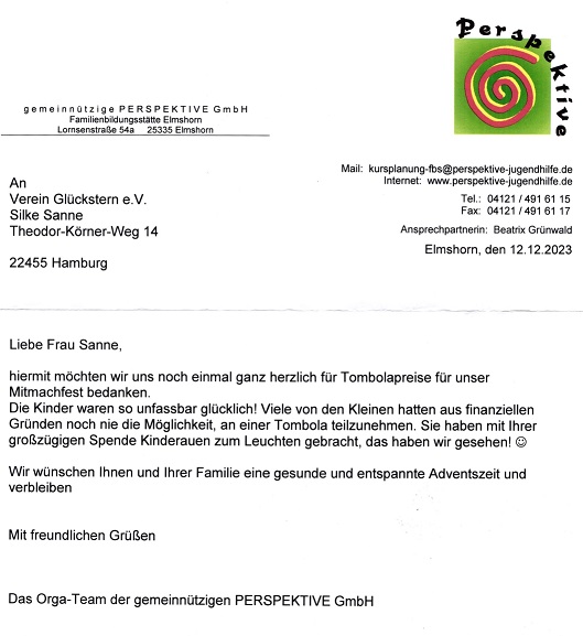 Im Jahr 2024 unterstützte der Verein die Tombola auf dem Mitmachfest der gemeinnützigen Perspektive GmbH Elmshorn. Schöne Preise für alle Altersgruppen wurden dafür zur Verfügung gestellt. Dem Dankesschreiben der gemeinnützigen GmbH Elmshorn konnten wir wieder entnehmen, dass das gesamte Mitmachfest sowie die Tombola auch dank unserer Preise ein voller Erfolg war und die Kinder und Jugendlichen sich sehr darüber gefreut haben.