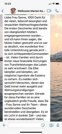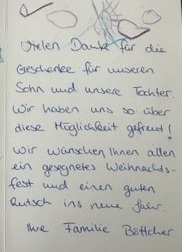 ich, meine Kolleg*innen und vor allem die Familien möchten sich für die tollen Weihnachtsgeschenke bedanken. Alle Geschenke sind so gut angekommen und die Kinder haben sich sehr gefreut. Gestern hat mich gerade wieder eine Mama angesprochen und meinte, dass ich auch ihren Dank an Sie weitertragen soll.