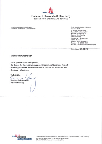 Weiterhin möchten wir auch DANKE sagen bei Spendern, die uns ebenfalls über Jahre unterstützen. So müssen unbedingt die Ernst-Commentz-Stiftung sowie die Wirtschafts- und Steuerberatungsgesellschaft Dr. Ehlers, Gruttke, die Gert und Barbara Schmidt-Stiftung, Tanzschule Heiko Stender, RADUE Immobilien sowie das E-Center Struve in Eidelstedt sowie Frau Dr. Britta Bradshaw von der Kanzlei am Rathaus genannt werden. Aber auch viele andere, oft auch private Spender haben uns großartig unterstützt, wofür wir uns recht herzlich bedanken möchten.