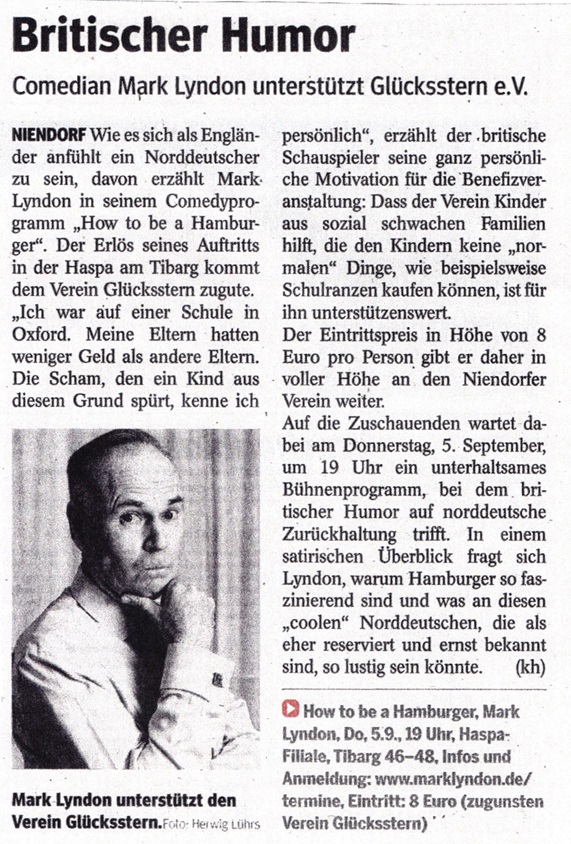 Im September fand in der Haspa-Filiale am Tibarg eine Veranstaltung des Comedian Mark Lyndon statt, dessen Erlös dem Verein Glücksstern e.V. zugute kam. Dies war eine großartige Aktion über die wir uns sehr gefreut haben, außerdem gab es an diesem Abend noch mehrere Spender, so z. B. das Restaurant „The Eatalian“ im Tibarg-Center, die den Erlös dieses Abends noch weiter erhöht haben. Ein herzliches Dankeschön an Herrn Lyndon und alle anderen Spender.