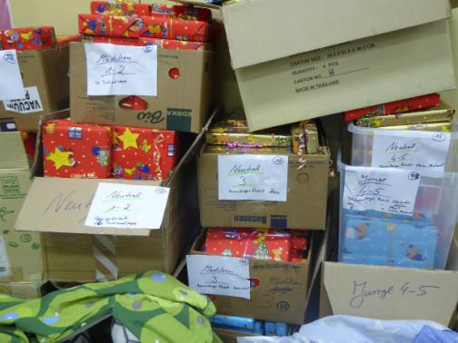 Geschafft ! Auch dieses Jahr wurden wieder über 2.700 Geschenke für Kinder aus sozialschwachen Familien besorgt, verpackt und verteilt. Wir bedanken uns recht herzlich für die vielen Spenden und alle helfenden Hände, die es ermöglicht haben, dass vielen Kindern, die ansonsten mit leeren Händen zu Weihnachten dagestanden hätten, nun ein schönes Fest bevorsteht. Gerade bei den Einzelwünschen, die laut Wunschliste erfüllt wurden, treibt einem die Bescheidenheit der Wünsche oft ein Tränchen ins Auge. Was bei vielen Kindern oft schnell beiseite gelegt wird, sollten sie es unter dem Weihnachtsbaum finden, ist für andere das größte und einzige Geschenk. So standen auch dieses Jahr wieder eine Mütze, Handschuhe oder ähnliches auf den Wunschzetteln. Schön, wenn man diesen Kindern eine Freude bereiten kann. Allein dafür lohnt sich das ganze Engagement.
