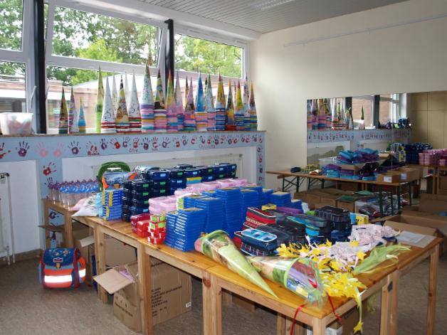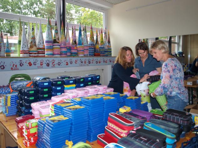 160 Erstklässler bzw. Vorschulkinder sozial benachteiligter Familien erhalten die Grundausstattung für den Schulbeginn. Es werden über 100 Schultüten gepackt bzw. gehen die Materialien so in die einzelnen Einrichtungen, da auch manche Eltern die Tüte selbst zur Verfügung stellen bzw. selbst gebastelt haben.